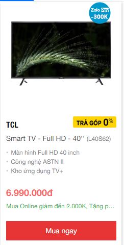 SMART TIVI TCL 40 INCH L40S62 là dòng smart tivi giá rẻ hiện nay. Cho nên chỉ cần hơn 6 triệu là bạn có ngay chiếc smart tivi lên tới 40”, độ phẩn giải Full HD rõ nét miễn chê. Với kho ứng dụng TV+ OS phong phú đầy đủ cho mọi nhu cầu giải trí hay xem phim. Với tivi TLC có thêm trang bị T-Cast giúp bạn chia sẻ video, hình ảnh, nhạc từ nhiều thiết bị lên màn hình tivi dễ dàng. Với Smart tivi TCL giá rẻ có đầy đủ mọi tính năng thông minh cần dùng thì cũng rất đang để mua và tiết kiệm cho bạn kha khá nếu so với sản phẩm Sony, LG hay Samsung cùng loại.